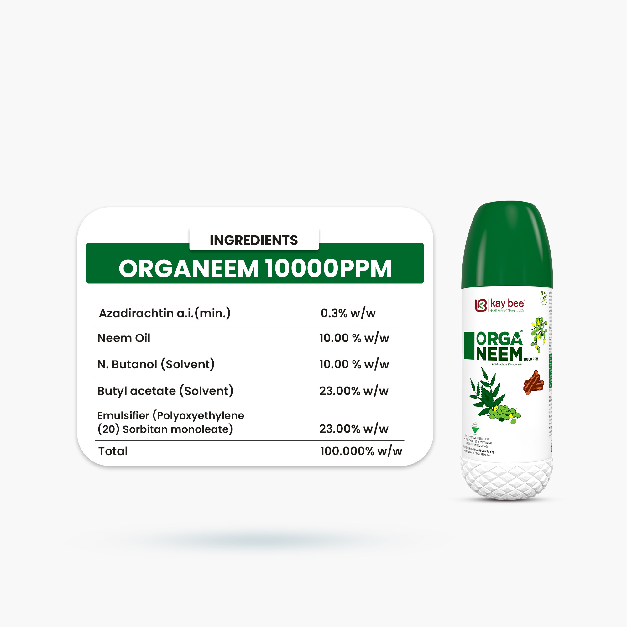 - Organeem 10000 ppm is an organic neem oil insecticide effective against all types of sucking and larval pests affecting various plants and crops.